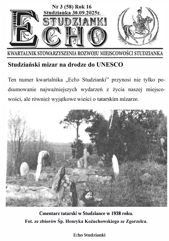 Oddajemy w Państwa ręce 58. numer kwartalnika „Echo Studzianki”. W bieżącym wydaniu piszemy o tatarski mizarze w Studziance, który może już niedługo znaleźć się na tej prestiżowej liście jako jeden z najcenniejszych skarbów naszego regionu.