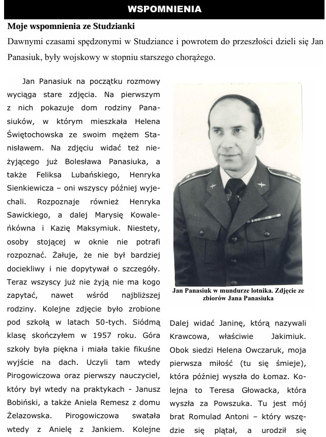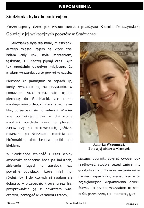 W tym wydaniu nie zabrakło także wspomnień – swoimi dziecięcymi przeżyciami ze Studzianki dzieli się Kamila Telaczyńska – Golwiej z Łomaz, która opowiada, jak każdego roku z niecierpliwością oczekiwała letnich wakacji w Studziance.
