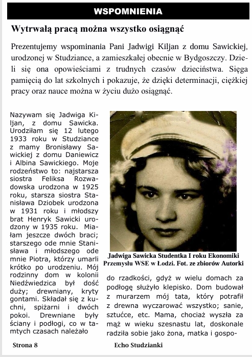 W bieżącym sześćdziesiątym wydaniu już numerze kwartalnika „Echo Studzianki” prezentujemy wspominania Pani Jadwigi Kiljan z domu Sawickiej, urodzonej w Studziance, a zamieszkałej obecnie w Bydgoszczy. Dzieli się ona z Czytelnikami opowieściami z trudnych czasów dzieciństwa. Sięga pamięcią do lat szkolnych i pokazuje, że dzięki determinacji, ciężkiej pracy oraz nauce można w życiu dużo osiągnąć.