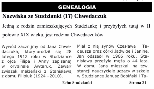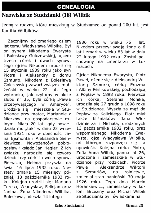 W kolejnym genealogicznym publikujmy skrótowo rodowód rodzin Wilbików i Chwedaczuków i ich pochodzenie w linii męskiej.