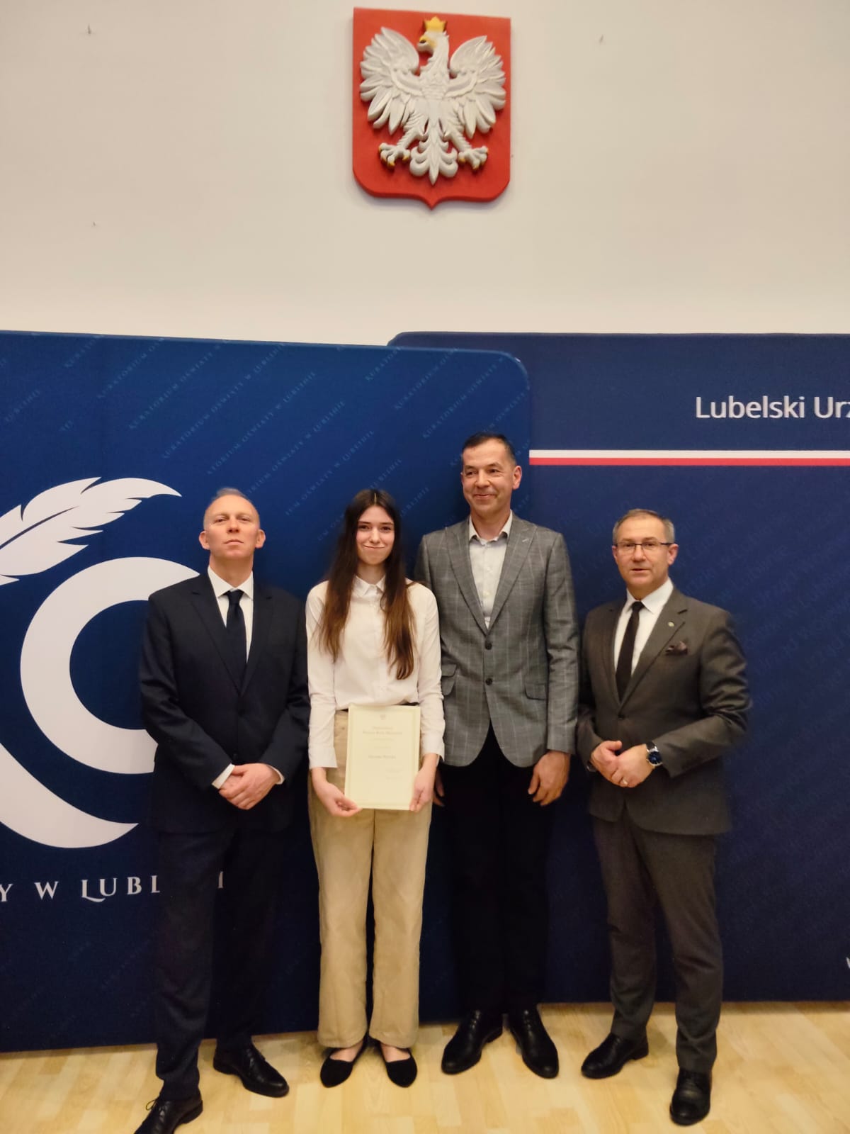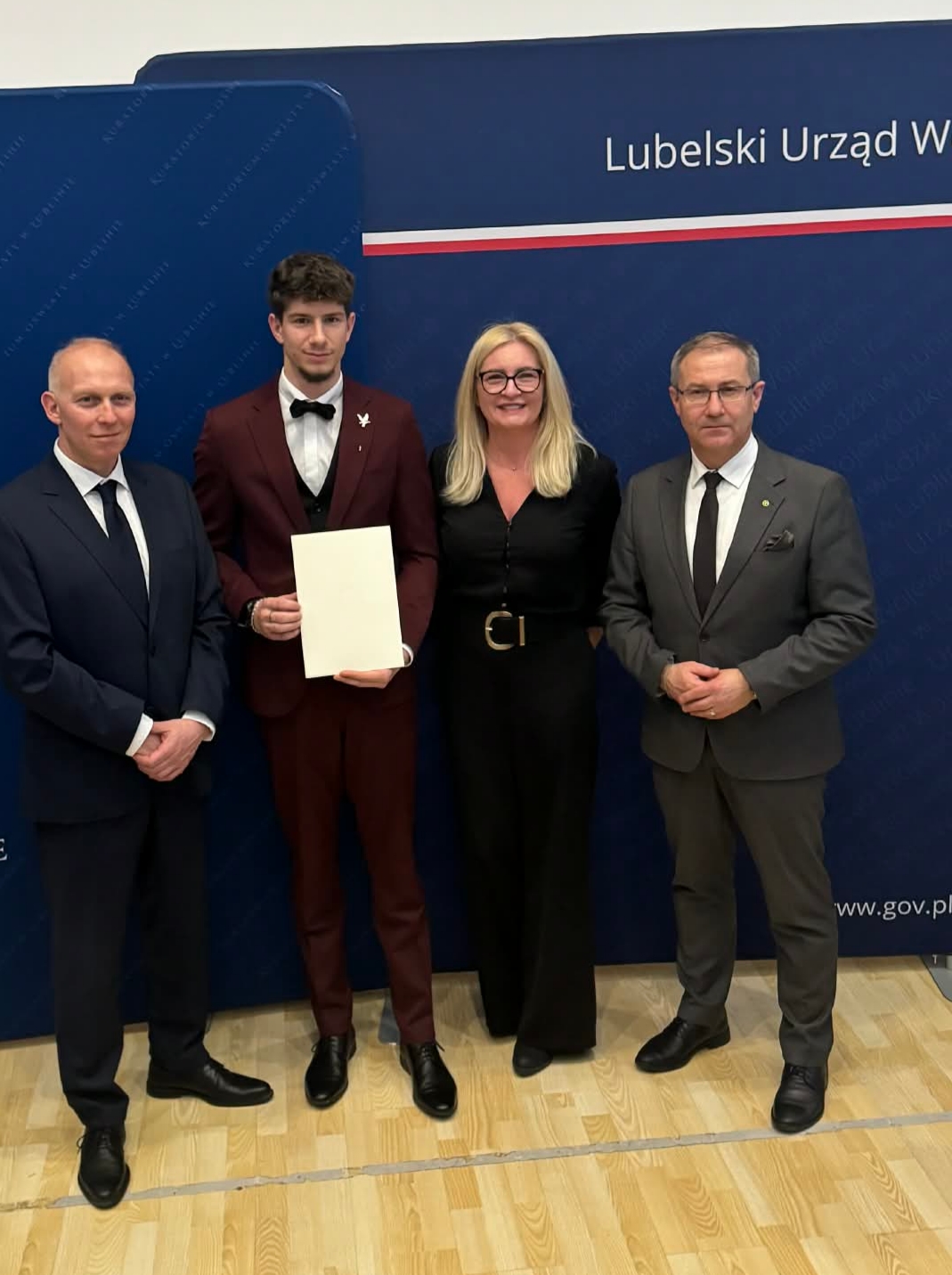 od lewej stoją: Kurator Wojewódzki Tomasz Szabłowski, Zuzanna Wysocka, Grzegorz Wysocki, Wicewojewoda Lubelski Andrzej Maj.