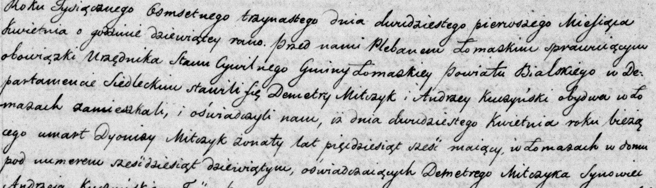 Fragment aktu zgonu Dionizego Miczko (Mitczyka) z 1813 roku. Dokument ze zbiorów Archiwum Państwowego w Lublinie, Akta stanu cywilnego Parafii Greckokatolickiej w Łomazach, sygn. akt 35/2088/0/1/5, s. 14.