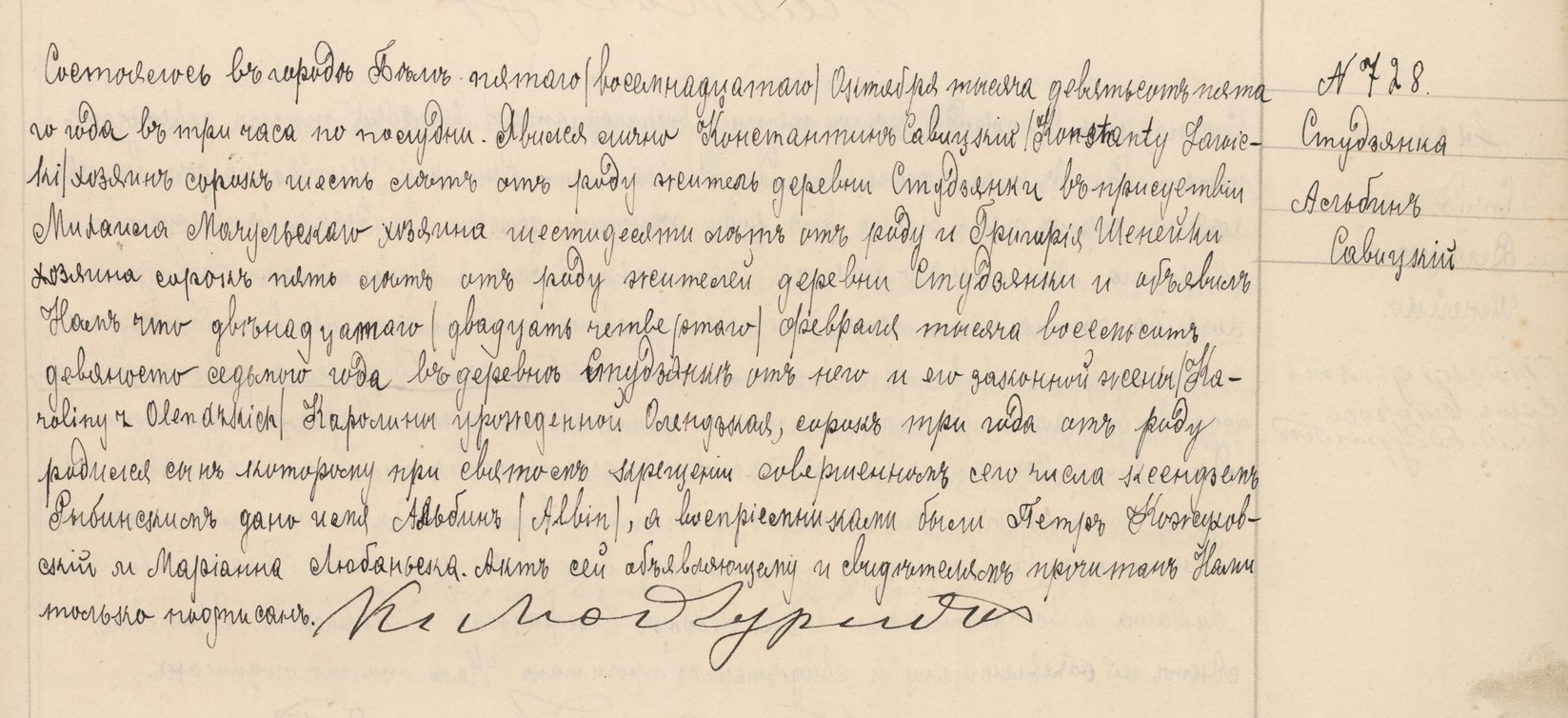 Miało to miejsce w mieście Biala, dnia piątego /osiemnastego/ października tysiąc dziewięćset piątego roku o godzinie trzeciej po południu. Konstantin Sawicki, właściciel wsi Studzianka, lat czterdzieści sześć, w obecności Michała Moczulskiego, sześćdziesięcioletniego rolnika, i Grzegorza Szenejki, właściciela wsi Studzianka, lat 45 pięć, osobiście stawili się i oświadczyli nam, że dwunastego (dwudziestego czwartego) lutego tysiąc osiemset dziewięćdziesiątego siódmego roku we wsi Studzianka urodził się jemu i jego żonie Karolinie, z domu Olendzkiej, lat 43, syn któremu nadano imię Albin a chrzestnymi byli Piotr Kożuchowski i Marianna Lubańska. Niniejszy dokument został odczytany wyłącznie przez nas składającemu oświadczenie i świadkom przedstawiony oraz podpisany